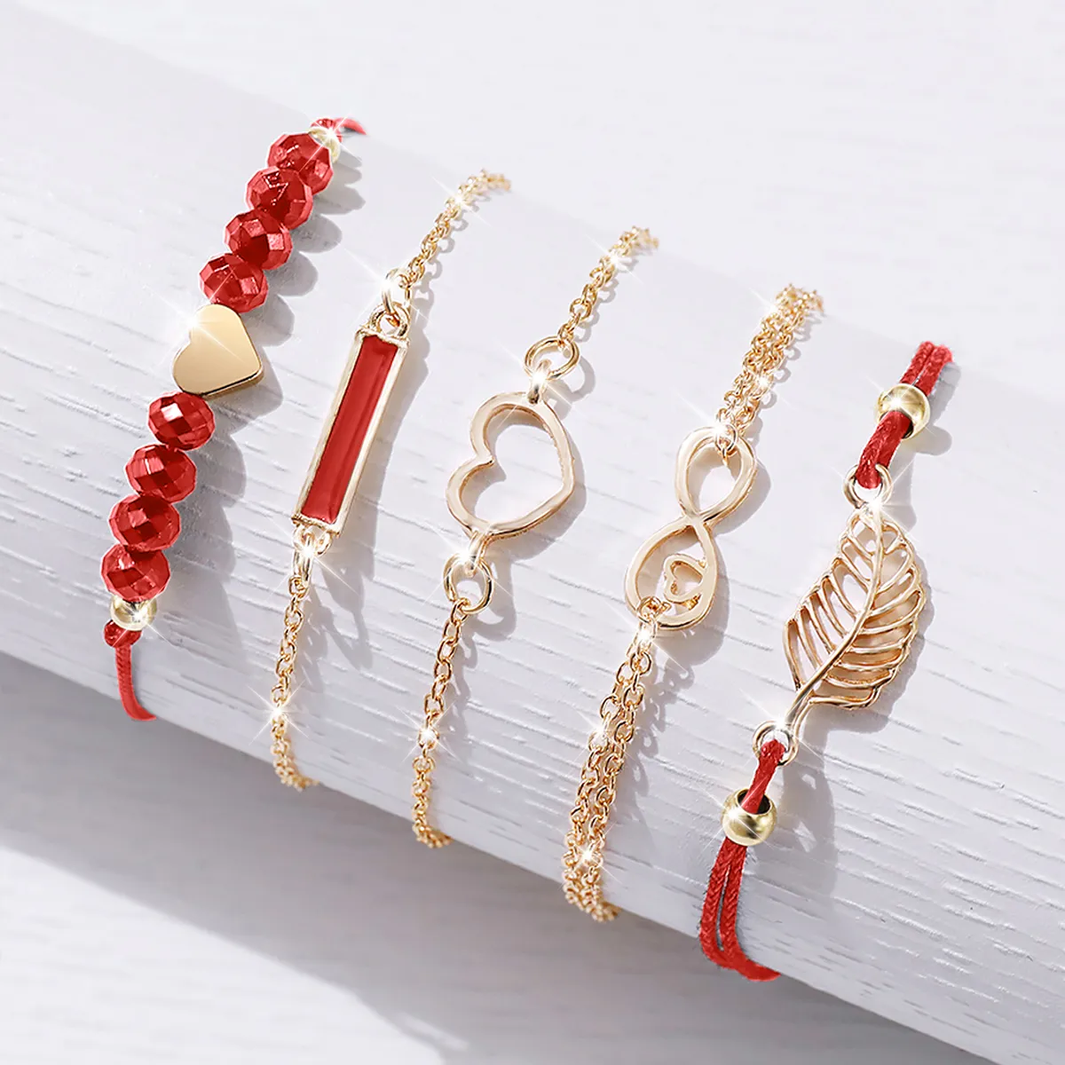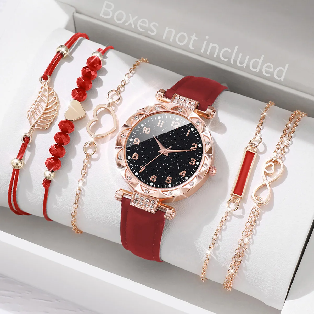 - 6PCS/Set Women's Watch Fashion Roma Heart Dial Leather Band Quartz Watches Leaf Bracelets Set(Without Box)