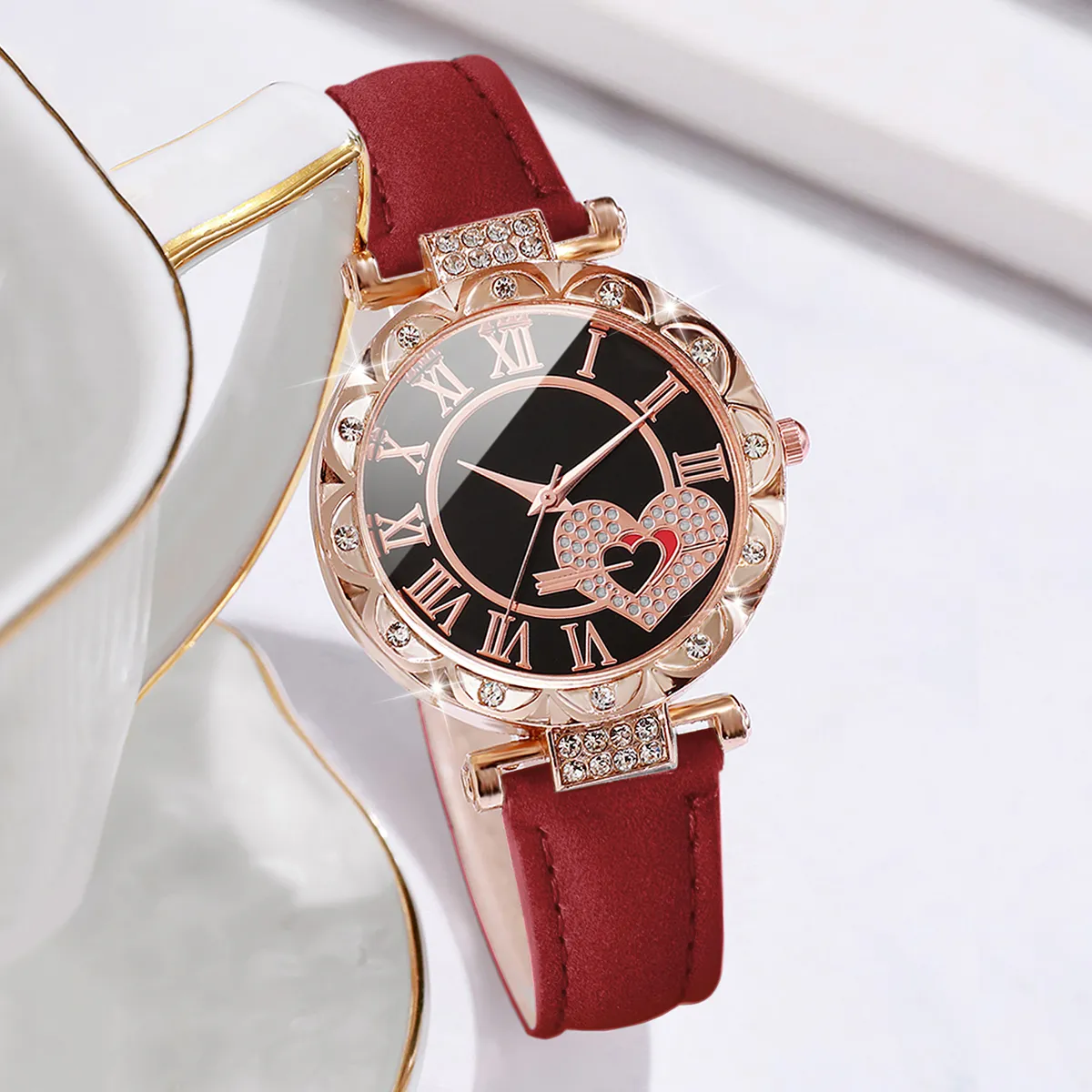 6PCS/Set Women's Watch Fashion Roma Heart Dial Leather Band Quartz